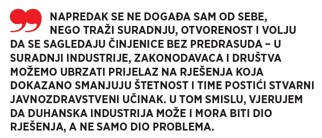 Kada pogledamo koliko se svijet promijenio u samo zadnje desetljeće, od električnih automobila koji su postali svakodnevica do umjetne inteligencije koja mijenja način na koji živimo, jasno je da transformacija više nije iznimka, nego pravilo. Isto vrijedi i za našu industriju. Duhanska industrija kakvu smo poznavali desetljećima zapravo nestaje pred našim očima. PMI već više od 10 godina gradi budućnost bez dima, a Hrvatska je dio tog puta. Vjerujem da će u idućih 10 do 20 godina cigarete postati stvar prošlosti, ali tempo te promjene ovisit će o spremnosti svih dionika da prihvate dijalog i znanost umjesto zastarjelih dogmi. Napredak se ne događa sam od sebe, nego traži suradnju, otvorenost i volju da se sagledaju činjenice bez predrasuda – u suradnji industrije, zakonodavaca i društva možemo ubrzati prijelaz na rješenja koja dokazano smanjuju štetnost i time postići stvarni javnozdravstveni učinak. U tom smislu, vjerujem da duhanska industrija može i mora biti dio rješenja, a ne samo dio problema.