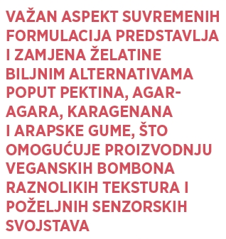 Širok spektar sastojaka u bombonskim proizvodima odražava sofisticiran pristup formulacijama, pri čemu svaka kombinacija šećera, tvari za želiranje, proteina, emulgatora i drugih sastojaka (ovisno o vrsti) ciljano oblikuje teksturu, stabilnost i senzorska svojstva proizvoda.