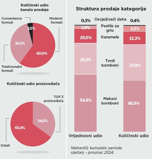 Preostali udio od 3,5% se ostvario kroz convenience formate, koji uključuju kioske i benzinske postaje. U 2024. godini vodeća tri proizvođača zastupala su 34,6% količinske prodaje kategorije bombona. Abecednim redoslijedom oni su Haribo, Kraš Group i Mederer.