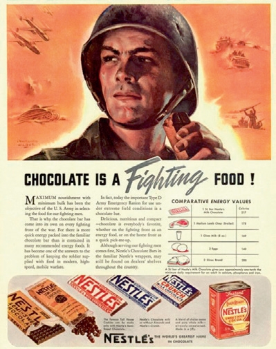 Čokolada se na počecima (kraj 19. i početak 20. stoljeća) oglašavala kao zdrava i hranjiva namirnica. Kampanje su naglašavale racionalne benefite proizvoda poput čistoće i kvalitete proizvoda, često je prikazujući kao pouzdanu hranu za obitelji, djecu i vojnike.