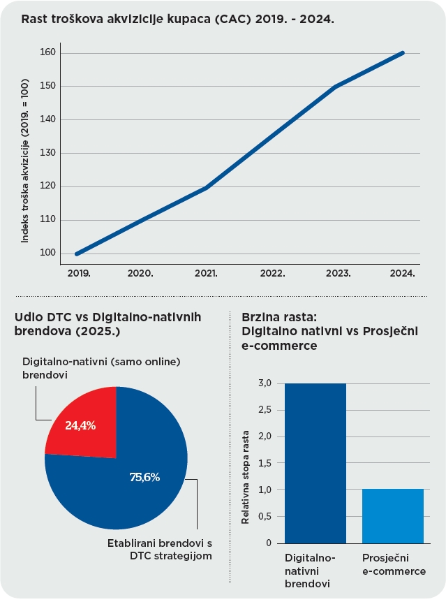 Digitalno-nativni brendovi dokazali su da je moguće izgraditi multimilijunski biznis isključivo online – Warby Parker, Casper, Away, Glossier, Dollar Shave Club i drugi postigli su ‘unicorn’ status. Međutim, golden era pure-play DTC brendova vjerojatno je iza nas. Etablirani brendovi poput Samsunga, Dysona i Nikea dominiraju DTC prostorom s 75,6% ukupnog tržišta jer kombiniraju prednosti direktne prodaje (kontrola podataka, korisničkog iskustva i margina) s resursima, reputacijom i diversificiranim kanalima prodaje koje digitalno-nativni startupovi teško mogu replicirati. Budućnost nije ‘DTC ili smrt’ – riječ je o omnichannel integraciji gdje brendovi prodaju direktno, preko veleprodajnih partnera i fizičkih lokacija istovremeno. Oni koji opstanu bit će oni koji uspješno balansiraju agilnost digitalno-nativnog brenda s operativnom disciplinom i financijskom održivošću etabliranih igrača.