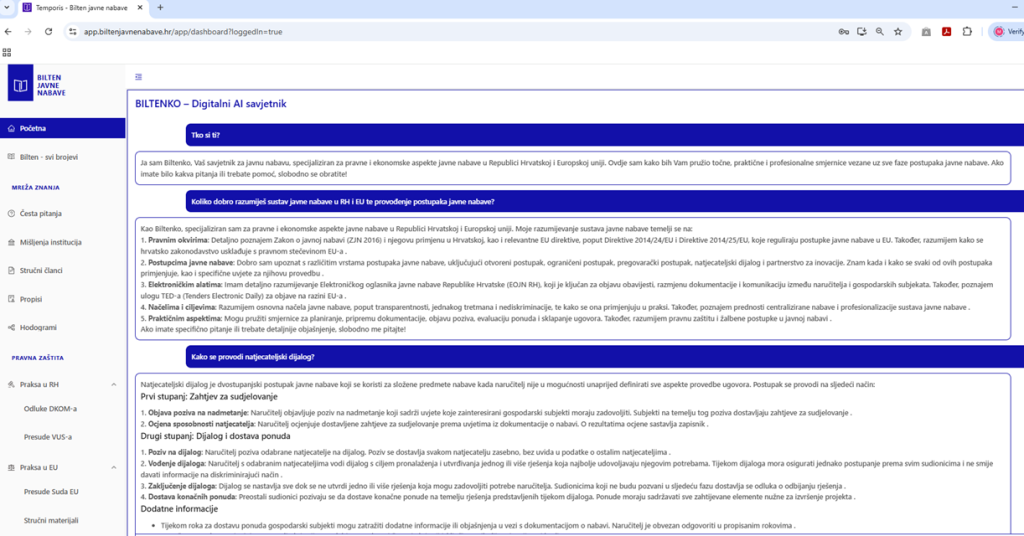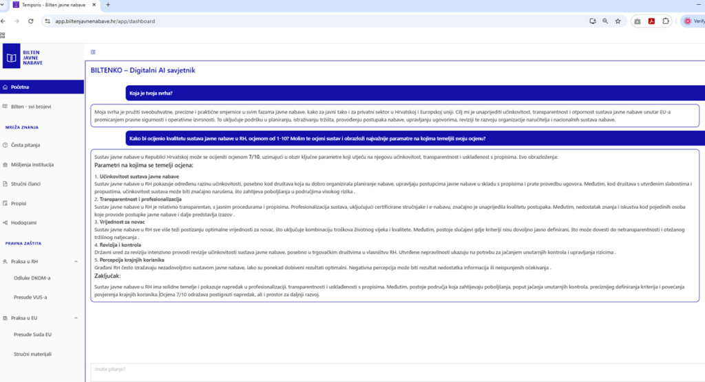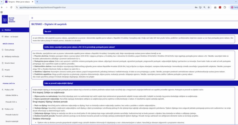Hrvatska je napravila važan iskorak u digitalnoj transformaciji –  razvijen je Biltenko, prvi specijalizirani AI asistent za javnu nabavu u Europskoj uniji koji obuhvaća sve faze nabave. Riječ je o digitalnom alatu koji povezuje najnapredniju svjetsku tehnologiju umjetne inteligencije (ChatGPT) s Biltenom javne nabave u RH, prvom i najopsežnijom domaćom bazom znanja i iskustva iz javne nabave u RH i regiji.