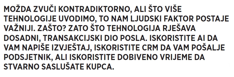 Najveća promjena koju vidim u radu s klijentima nije tehnološka, nego menadžerska. Prodajni lider više ne može biti samo motivator koji ‘gura’ tim da zove više. On mora postati strateg koji razumije procese, algoritme i digitalne alate. Mora razumjeti kako da tehnologija radi za njega i za kupca, a ne protiv njih. Inovativne tehnologije su tu da vam očiste put. One vam daju supermoći, skraćuju prodajni ciklus i omogućuju da budete prisutni točno tamo gdje vas kupac traži. No ipak, onaj zadnji korak – trenutak povjerenja u kojem kupac odluči pružiti karticu ili potpisati ugovor, to je i dalje vaš teren. Jer, tehnologija je alat, ali vi ste ti koji vode igru.
