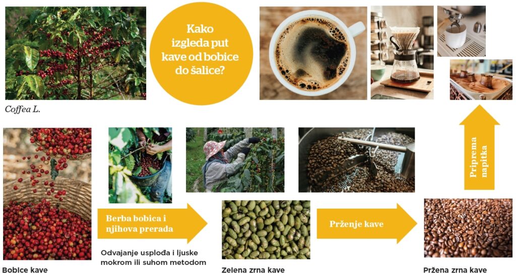 Arabika kava se smatra superiornijom zbog svojih senzornih svojstava i stoga postiže više cijene na međunarodnom tržištu nego Robusta. Put od ubranih zrelih plodova kave do šalice napitka je zahtjevan i uključuje brojne postupke primarne (suha ili mokra prerada plodova kave) i sekundarne (prženje i priprema napitka) prerade, kako je prikazano na slici ispod.