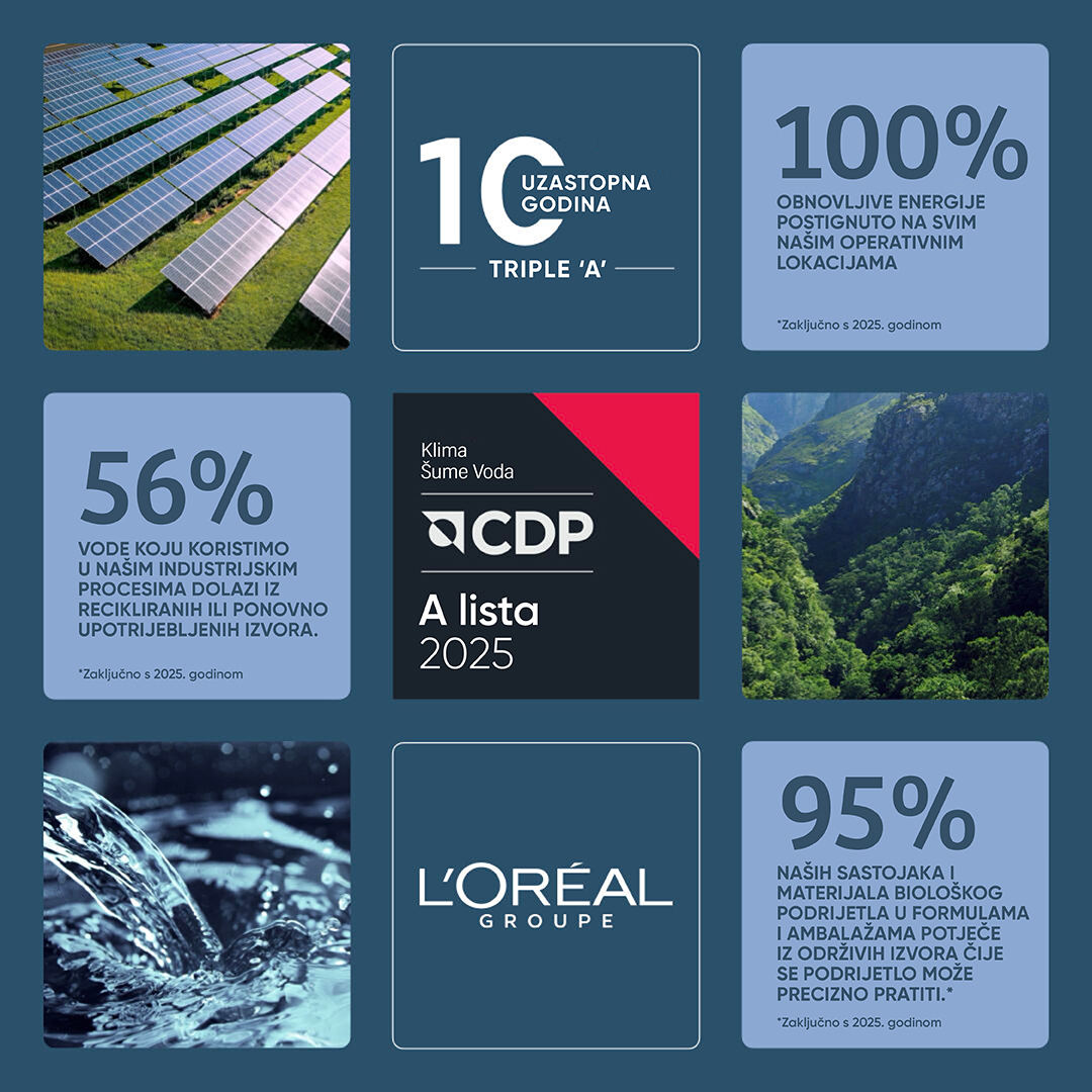 L’Oréal je tako prva i jedina tvrtka na svijetu koja je dobila ovo priznanje deseti put zaredom, dokazujući da ambiciozni ekološki ciljevi idu ruku pod ruku s poslovnim uspjehom. Osim CDP-a, L’Oréalov trud prepoznao je i EcoVadis, koji je kompaniju četvrtu godinu zaredom svrstao u sam vrh (top 1 %) najviše ocijenjenih poduzeća na svijetu u kategorijama okoliša, etike, ljudskih prava i održive nabave.