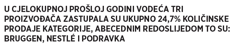 U cjelokupnoj prošloj godini vodeća tri proizvođača zastupala su ukupno 24,7% količinske prodaje kategorije žitarica za doručak. Abecednim redoslijedom to su: Bruggen, Nestlé i Podravka. Uz to, bitan udio u količinskoj prodaji kategorije predstavljaju i proizvodi privatnih robnih marki.