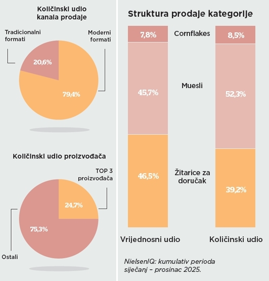 Unutar kategorije, 52,3% količinske prodaje čine muesli dok žitarice za doručak čine 39,2% prodaje. Najmanji segment u kategoriji je segment cornflakesa te on doprinosi kategoriji s 8,5% udjela. Što se tiče aspekta mjesta prodaje, čak 79,4% ukupne količinske prodaje kategorije žitarica za doručak u 2025. godini ostvarilo se kroz moderne formate (hipermarkete, supermarkete i diskontere).