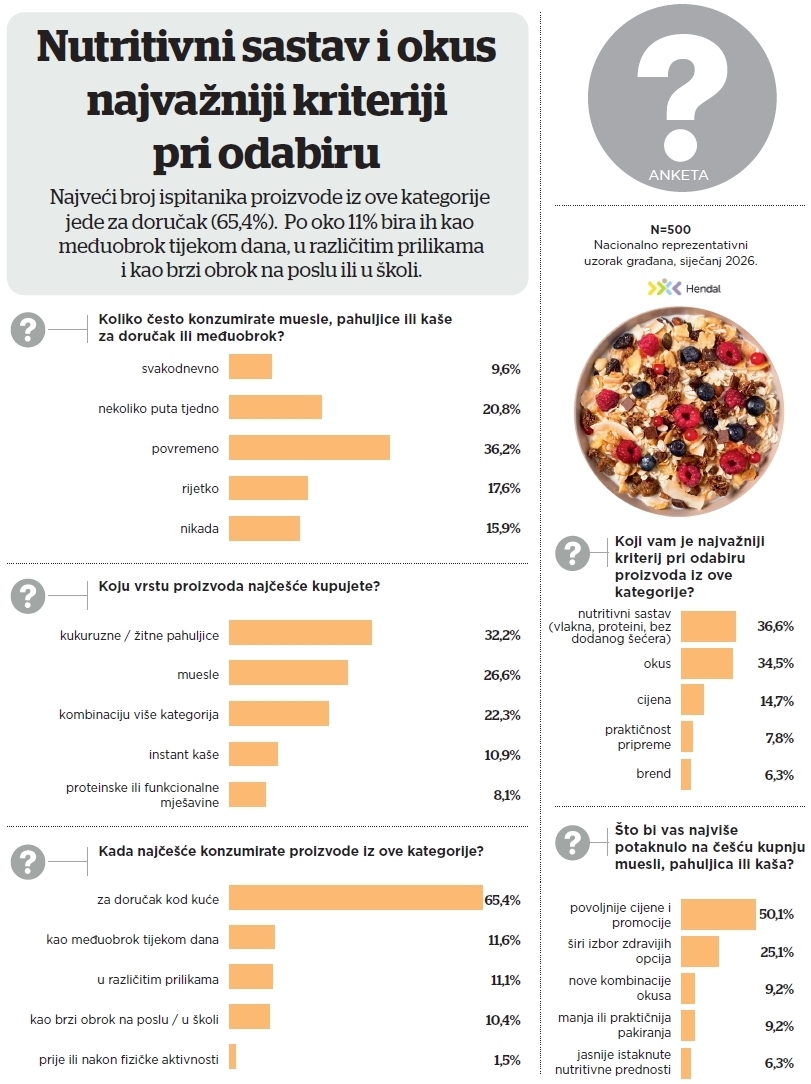 Unutar kategorije, 52,3% količinske prodaje čine ‘muesli’ dok žitarice za doručak čine 39,2% prodaje, a segment cornflakesa doprinosi kategoriji s 8,5% udjela