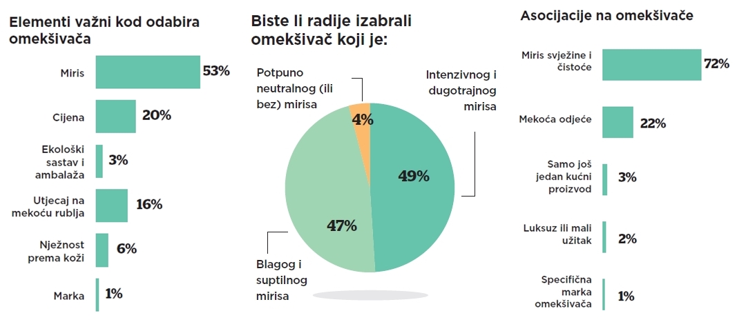 Kada pomislimo na omekšivač, većina potrošača ne razmišlja o sastavu ili formuli, već o osjećaju koji on izaziva. Na pitanje na što ih asocira omekšivač, čak 72% ispitanika odgovara – na miris svježine i čistoće, dok 22% kaže da ih prije svega podsjeća na mekoću odjeće. Najčešća asocijacija na omekšivače je miris svježine i čistoće značajno više zastupljena kod žena dok je mekoća odjeće asocijacija muškarcima te korisnicima kategorije u dobi od 60-75 godina. Ovi podaci pokazuju da je kategorija duboko povezana s emocionalnim doživljajem, a ne samo s funkcionalnim učinkom. Omekšivač je za mnoge simbol ugodnog doma, svježe opranih plahti i osjećaja njege – onih malih, gotovo neprimjetnih rituala koji svakodnevicu čine toplijom i ugodnijom.