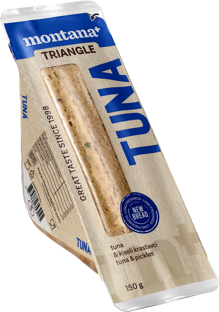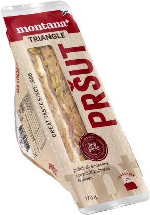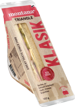 Legendarni hrvatski sendviči, Montana+ trokuti dobili su novi dizajn. Osvježen izgled ambalaže sada jasno komunicira vrstu punjenja kako bi potrošači brzo i lako na policama trgovina i benzinskih pumpi uočili svoj omiljeni sendvič. Svijetli, čisti papir idealna je podloga za velika tiskana slova, koloritom usklađena s nadjevima. Jednostavno imenovani – Klasik, Pršut, Kulen i Tuna, sendviči precizno komuniciraju delikatesna punjenja i okuse.