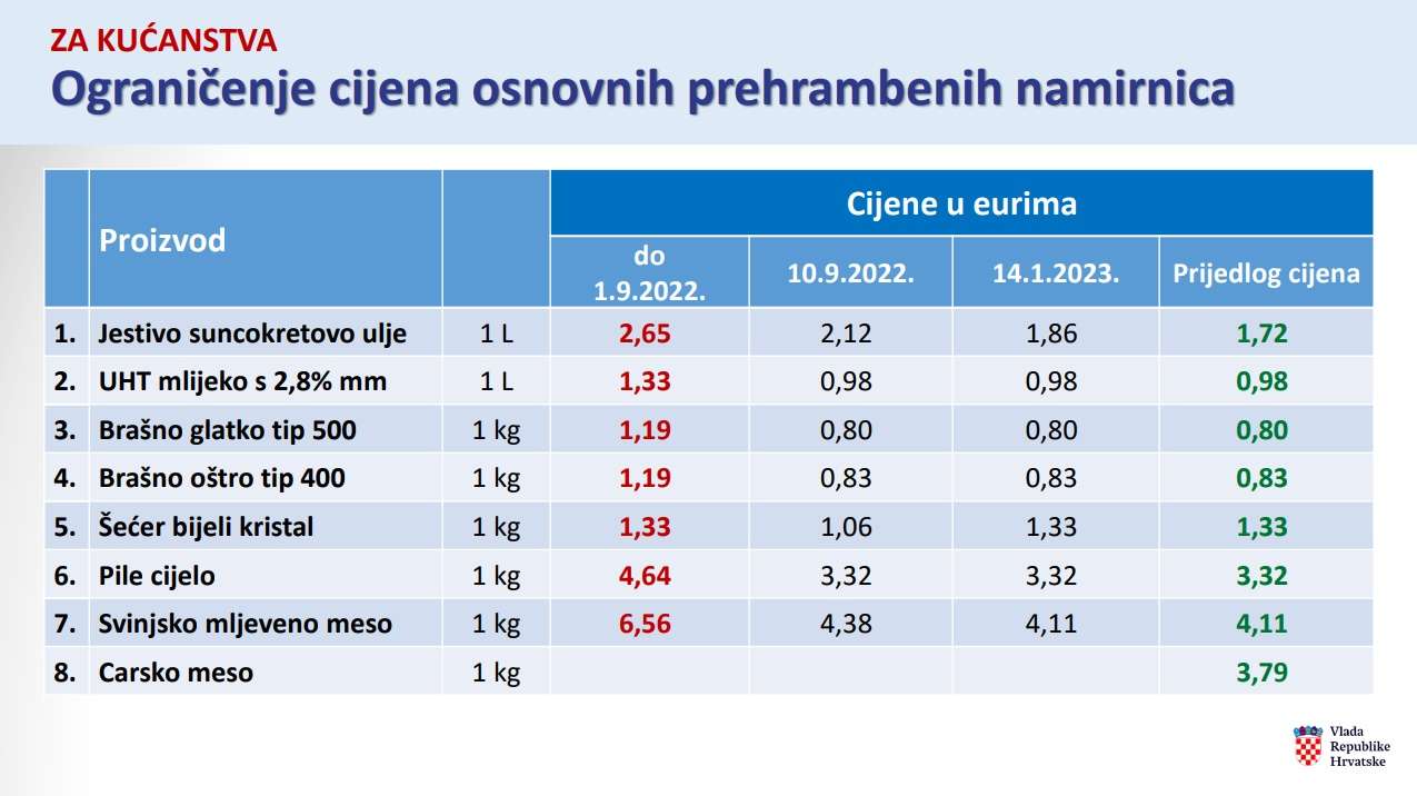 Prema prijedlogu, za jestivo suncokretovo ulje cijena bi bila niža – 1,72 eura za litru (do sada 1,86 eura), dok bi iste cijene ostale za mlijeko, brašno (glatko i oštro), šećer, cijelo pile i svinjsko mljeveno meso, a za carsko meso bila bi 3,79 eura za kilogram.