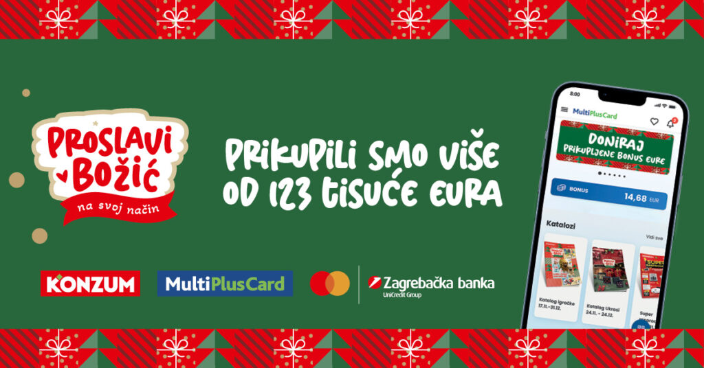 U jubilarnoj, petoj godini tradicionalne blagdanske inicijative „Proslavi Božić na svoj način“, Konzum i MultiPlusCard, uz partnere Zagrebačku banku i Mastercard, ponovno su pokazali snagu zajedništva i solidarnosti. Tijekom prosinca prikupljeno je više od 123 tisuće eura, koji su namijenjeni udrugama i ustanovama diljem Hrvatske koje svakodnevno skrbe o djeci, mladima, ženama, starijim osobama i napuštenim životinjama.