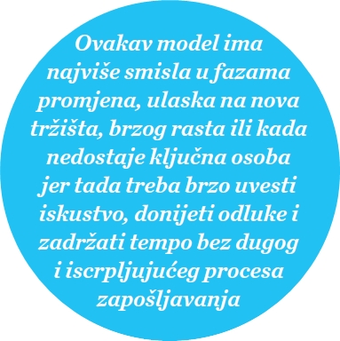 Ovakav model ima najviše smisla u fazama promjena, ulaska na nova tržišta, brzog rasta ili kada nedostaje ključna osoba jer tada treba brzo uvesti iskustvo, donijeti odluke i zadržati tempo bez dugog i iscrpljujućeg procesa zapošljavanja. Istovremeno, sve više iskusnih profesionalaca bira ovakav način rada jer im daje veću fleksibilnost, rad na više projekata te širi raspon iskustava – što ga čini logičnim nastavkom karijere nakon klasičnih korporativnih uloga.