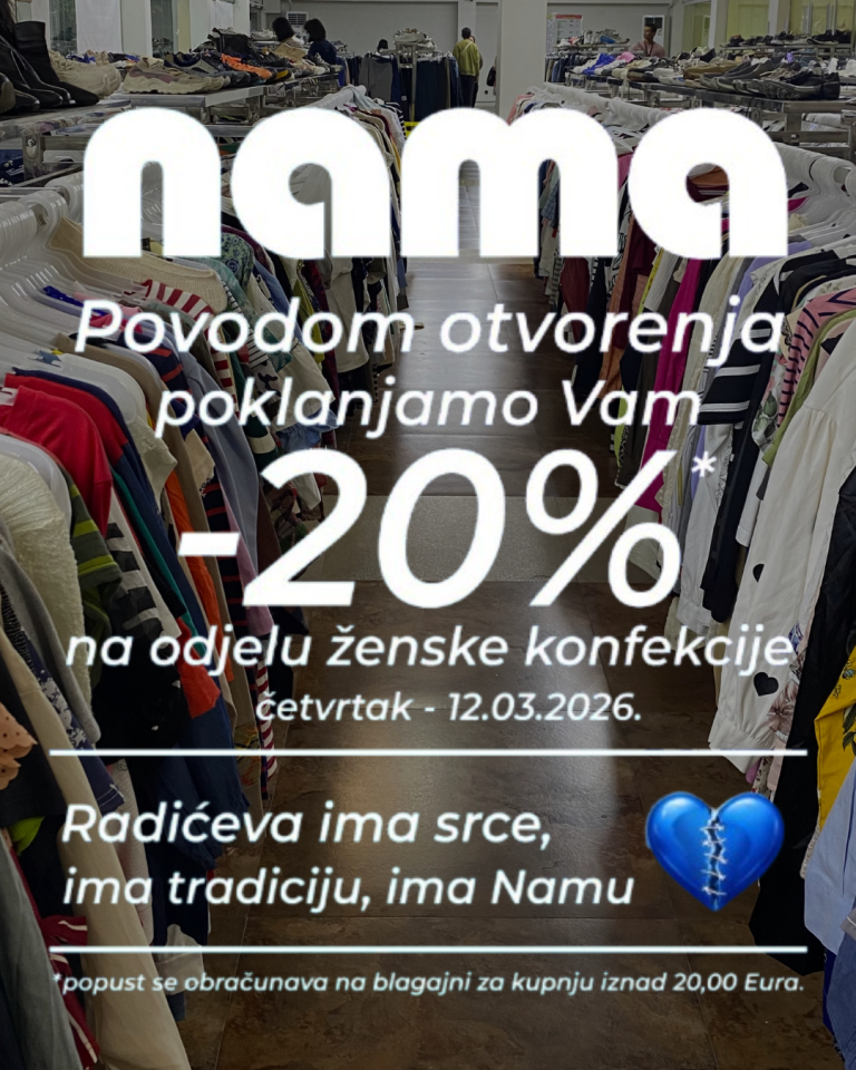 Ponovno otvaranje donosi novo poglavlje, ali i onu istu Namu koju građani pamte i vole. Posjetitelji će moći razgledati odjele ženske konfekcije, obuće i kožne galanterije, a povodom otvorenja pripremljena je i posebna pogodnost za kupce.