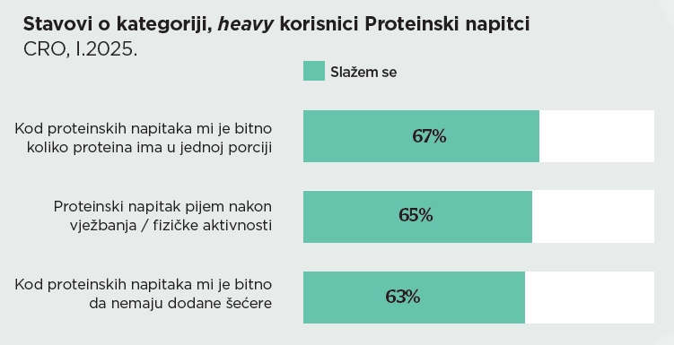 Dvije trećine heavy usera proteinskih napitaka navodi kako im je bitno koliko proteina ima u jednoj porciji proteinskog napitka. Sličan broj navodi kako proteinski napitak piju nakon treninga / fizičke aktivnosti te da im je bitno da proteinski napitak koji konzumiraju nema dodane šećere.