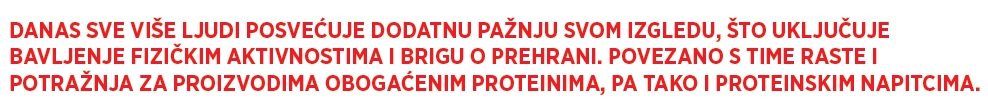 Danas sve više ljudi posvećuje dodatnu pažnju svom izgledu, što uključuje bavljenje fizičkim aktivnostima i brigu o prehrani. Povezano s time raste i potražnja za proizvodima obogaćenim proteinima. Imajući to na umu, 29% Hrvata u dobi od 16. do 64. godine barem ponekad konzumira proteinske napitke.