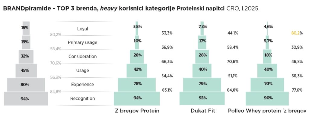 Potrošače kategorije proteinskih napitaka smatramo onima koji su koristili kategoriju u posljednjih mjesec dana. Promatrano na heavy userima proteinskih napitaka, prvo mjesto je zauzeo ‘Z bregov Protein s 42% korisnika u posljednjih mjesec dana. Na drugom mjestu s 40% korisnika nalazi se Dukat Fit, a na trećem mjestu je Polleo Whey protein ‘Z bregov s 40% korisnika.