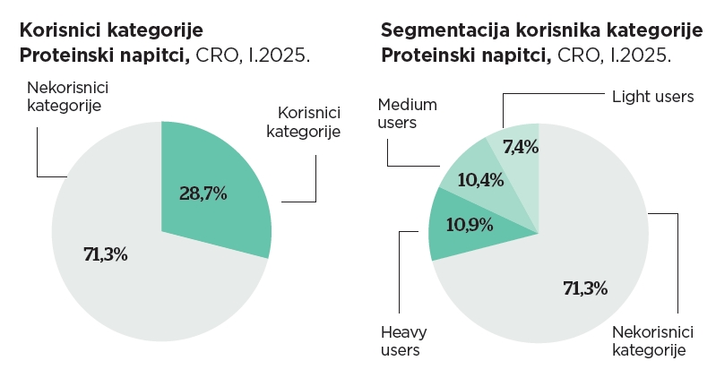 Heavy usera koji piju proteinske napitke barem 2 do 3 puta tjedno brojimo 11%. Medium usera koji ih piju jednom tjedno do jednom mjesečno brojimo 10%, a light usera koji piju proteinske napitke rjeđe od jednom mjesečno ima 7%. Gotovo 40% korisnika kategorije navodi kako im je jako bitno koju marku proteinskih napitaka kupuju.