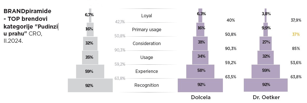 Korisnici brenda su isti konzumirali u posljednjih mjesec dana. Među korisnicima kategorije Pudinzi u dobi od 16. do 64. godine u Hrvatskoj, vodeći brendovi su Dolcela i Dr. Oetker. Brendovi su vrlo slični po svim parametrima. Oba brenda imaju iznimno visoku razinu prepoznatljivosti (recognition) među korisnicima kategorije. Slično tome, udio potrošača koji su konzumirali jedan ili drugi brend u posljednjih mjesec dana (usage) je vrlo sličan. Velika većina korisnika kategorije imala je i iskustvo (experience) s oba brenda, što potvrđuje njihovu široku dostupnost i prihvaćenost.