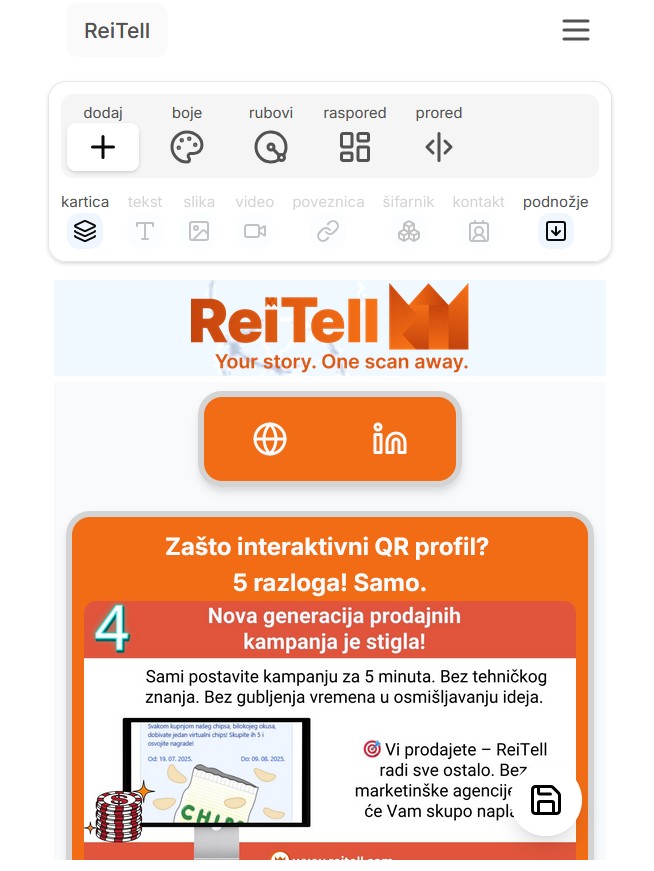 Sve to izgleda možda komplicirano za sprovesti, no ReiTell je profesionalna digitalna platforma putem koje možete u svoj QR profil ugraditi kompleksnu prodajnu kampanju s igricom ili bedževima u vremenu do 1 minute! Jasno, sve trebate i oglasiti, putem društevnih mreža, web stranice itd. Ne trebaju se raditi posebne kompleksne promotivne kampanje.