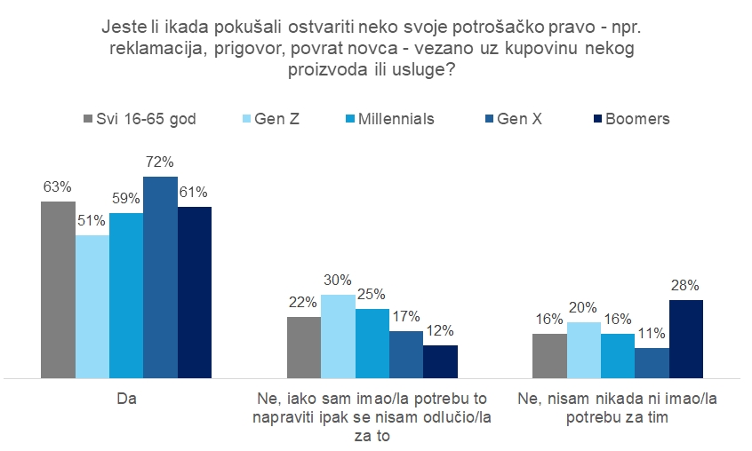 A čak 22% naših sugrađana se nikada, iako je imalo potrebu za tim, nije zauzelo za svoja potrošačka prava. Taj postotak je čak i viši među mlađima – među Gen Z iznosi 30%, i opada s dobi. Možemo zaključiti kako je zauzimanje za sebe u ovakvim situacijama nešto što se uči s godinama i životnim (ili možda prikladnije „potrošačkim“) iskustvom. No zanimljivo je i da među Boomersima imamo najviši udio (28%) onih koji smatraju kako za to nikada nisu ni imali potrebu – je li u pitanju racionalizacija ili objektivni doživljaj situacije morat ćemo istražiti nekom drugom prilikom.