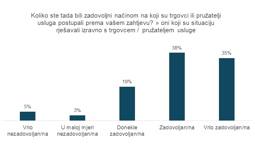 Za veliku većinu onih koji su se zauzeli za svoja potrošačka prava to je bilo pozitivno iskustvo – čak 73% onih koji su situaciju rješavali izravno s trgovcem ili pružateljem usluge zadovoljno je ili vrlo zadovoljno načinom na koji su trgovci ili pružatelji usluga postupali prema njihovom zahtjevu. Ovakva iskustva pokazuju da se kupcu isplati kontaktirati trgovca, proizvođača ili pružatelja usluga u situaciji.