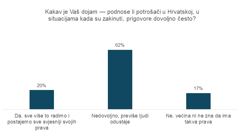 Generalno mišljenje je kako potrošači u Hrvatskoj, u situaciji kada su zakinuti, nedovoljno često podnose prigovore (62%), a nije rijedak ni stav kako ni ne znamo za takva prava (17%). Tek 20% nas smatra kako postajemo sve svjesniji svojih prava i sve više poduzimamo radnje za njihovo ostvarivanje.
