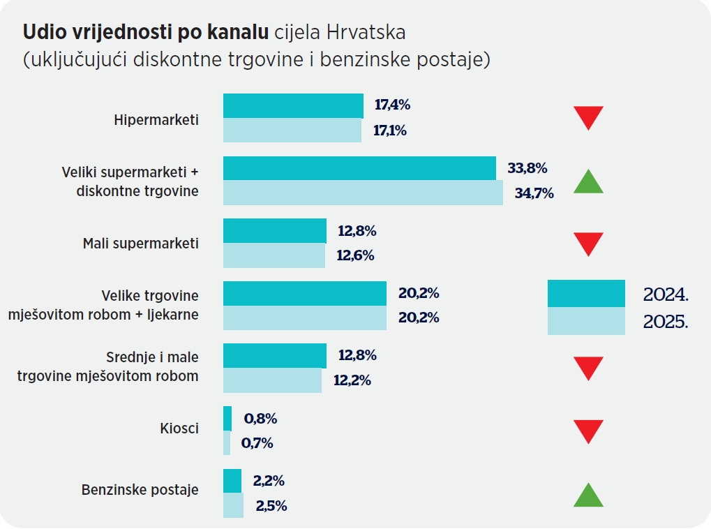 U kontekstu prodajnih kanala, supermarketi i dalje dominiraju u posjećenosti i učestalosti kupovine, dok tradicionalne trgovine i tržnice bilježe pad. Kanal velikih supermarketa i diskontera te kanal benzinskih postaja bilježe rast udjela u vrijednosti prodaje, dok hipermarketi i male trgovine bilježe pad.