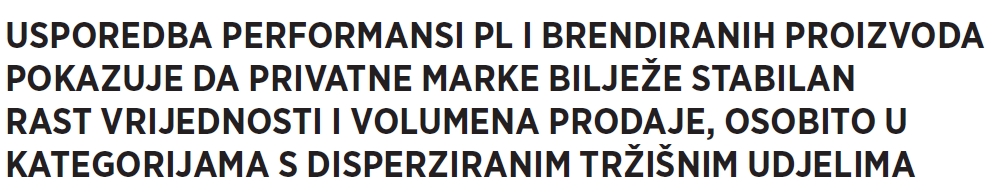 Usporedba performansi PL i brendiranih proizvoda pokazuje da privatne marke bilježe stabilan rast vrijednosti i volumena prodaje, osobito u kategorijama s disperziranim tržišnim udjelima. U tim kategorijama postoji prostor za rast i za PL i za brendove, što otvara mogućnosti za koegzistenciju i sinergiju. Postoje izazovi s obje strane.