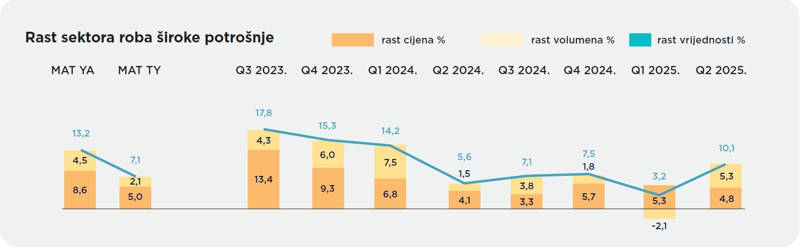 Iako je rast cijena usporen, percepcija potrošača o rastu cijena hrane ostaje visoka – čak 95% Hrvata smatra da su cijene hrane u porastu. Kao odgovor, 74% potrošača okreće se jeftinijim alternativama, što uključuje češće kupovine u diskontima, korištenje programa lojalnosti, kupovinu proizvoda na akciji te prelazak na privatne robne marke.