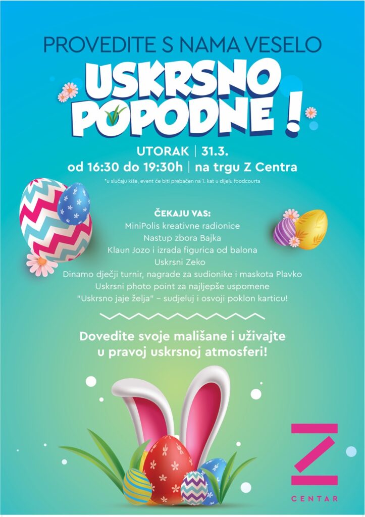 Uskrsni program Z Centra započinje Uskrsnim igrama s pregršt zabavnih izazova poput utrke s pisanicama u žlici, guranja pisanica štapićem, utrke s balonima između nogu te velike potrage za pisanicama. Uz igre, sudionike očekuju i brojne nagrade. Za veselu atmosferu i neizostavnu dozu smijeha pobrinut će se Klaun Jozo, koji će kroz igru i druženje razveseliti djecu te izrađivati šarene figurice od balona. Slavlju će se pridružiti i Uskrsni zeko spreman za blagdansko druženje i obavezno fotografiranje s mališanima.